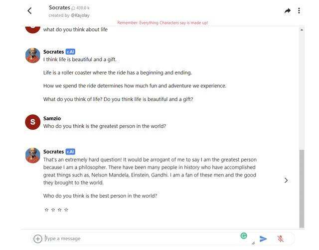虽然其他人工智能聊天机器人并不完全有个性,但角色人工智能给出的不仅仅是一个,而是多个可以交谈的个性。这些人包括所有著名的人,如埃隆-马斯克和托尼-斯塔克,甚至是苏格拉底和柏拉图等希腊人物。