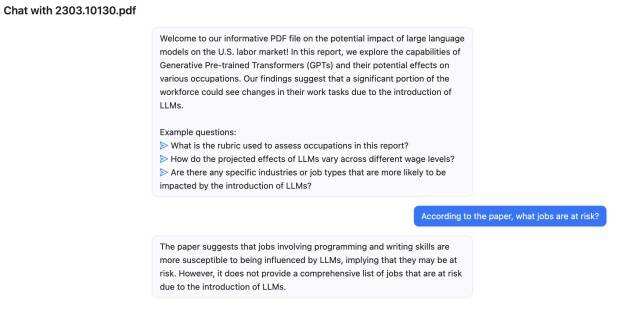 这意味着你可以向ChatPDF询问有关文件内容的任何问题,它将作出回答。我们用一些PDF文件进行了测试,包括长篇研究论文,该工具每次都能成功回答。如果没有提到信息,它就不会编造,并指出它是不可用的。
