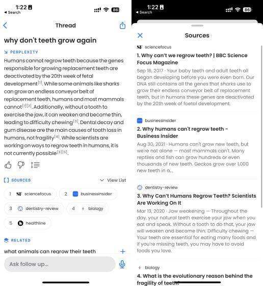 用户可以根据人工智能的搜索结果提出后续问题,它甚至可以提供来源。你可以搜索各种网站,包括Reddit、YouTube、新闻、维基百科和互联网。看看它的一些深入研究。