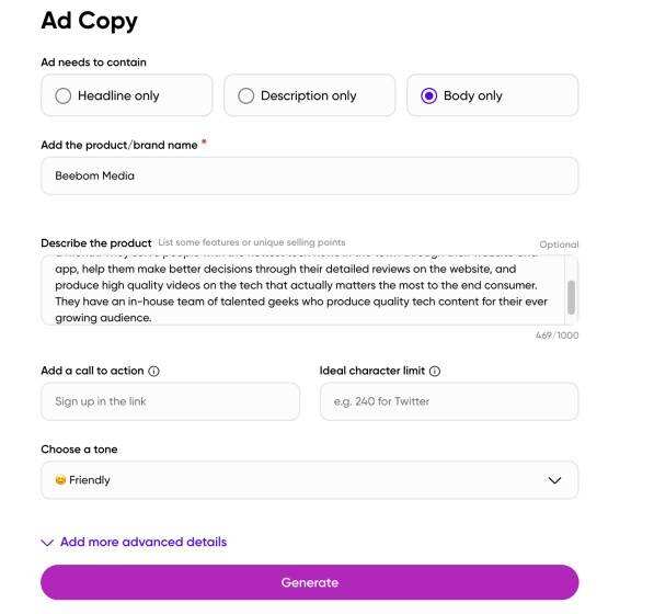 尽管有各种各样的人工智能应用,但好的免费应用却少之又少。值得庆幸的是,Picsart AI writer满足了所有要求。该人工智能作家集合了各种工具,如广告文案生成器、产品描述、Linkedin标题、网页副本、摘要等。