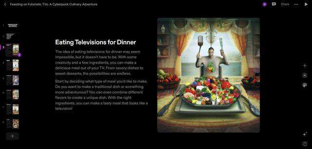 为此,Tome与DALL.E合作。开始使用就像给它一个主题一样简单。然后Tome将创建一个八张幻灯片的演示文稿,并为你制作。用户以后可以编辑它,并添加他们的投入。