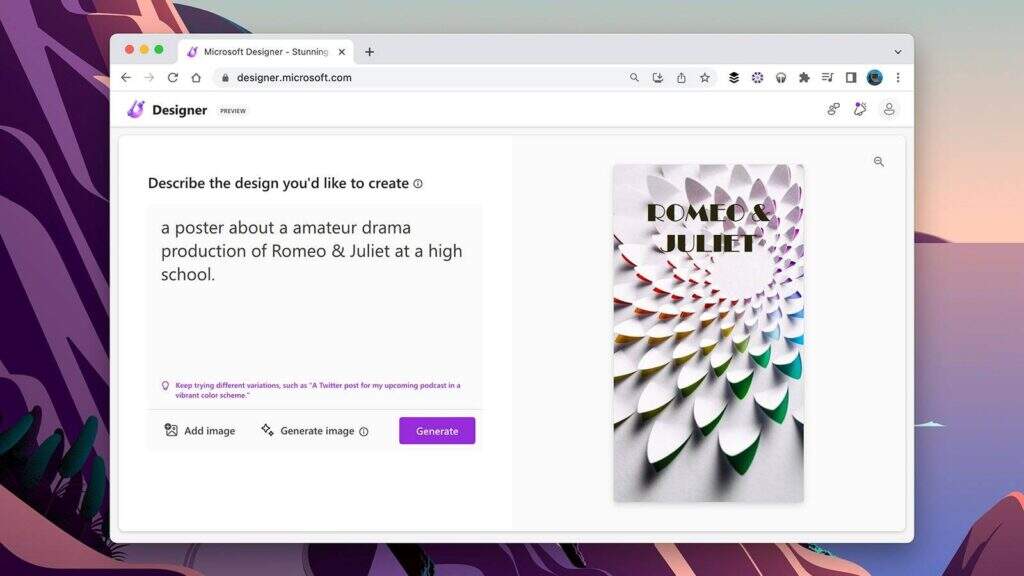 该工具旨在用于 “为我的教室制作返校海报” 或 “在Instagram上宣传我的新美容院” 等提示。与其他许多现在正在流行的人工智能工具一样,你能添加的细节越多越好,尽管微软设计师也能从较短的提示中产生非常好的结果。
