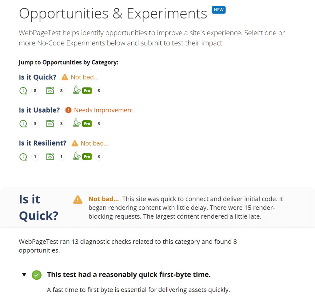 没有关于性能改进的说明。这在网站性能测试工具中有些常见。使用WebPageTest,你可以直接得到关于改善网站性能的机会的建议。然而,这些建议并不附带如何 - 实施它们的说明。这意味着你需要对一些主题进行研究,如如何延迟加载阻塞渲染的JavaScript或其他高级技术主题。