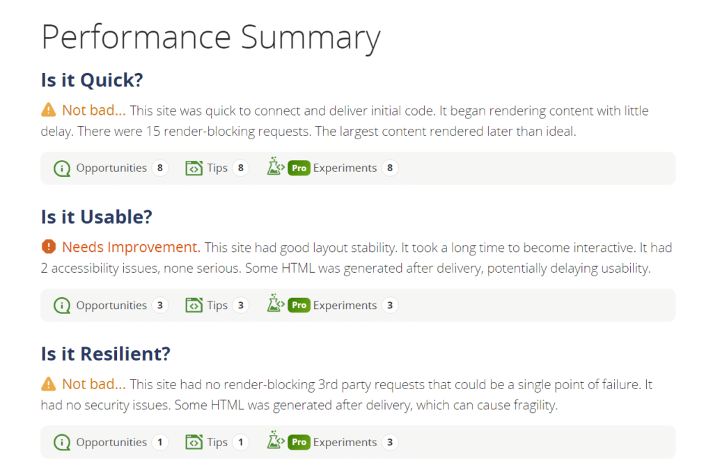 当涉及到解释结果时,我们建议你专注于WebPageTest报告的三个关键领域。首先是Performance Summary部分,它提供了你的网站结果的概述。它将向你展示你的网站在性能、可用性和弹性方面的情况: