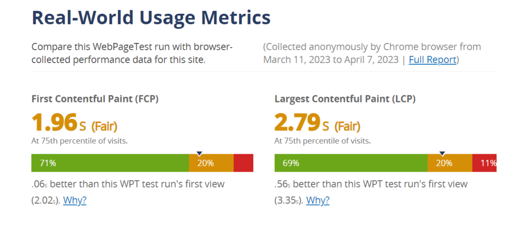 接着,”Real-World Usage Metrics” 部分显示了与其他用户最近的测试数据(如果有的话)相比较的相同指标的概况。为了全面了解你的网站的性能,我们建议你将这些指标与前面的Page Performance Metrics部分进行比较。