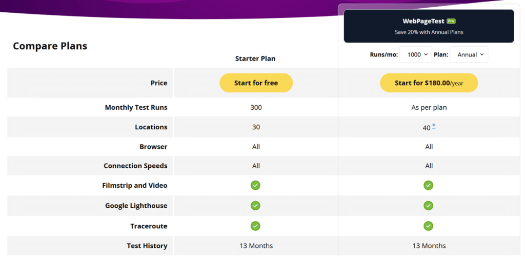 WebPageTest提供免费和高级两种计划。免费计划使你能够每月运行慷慨的300个测试。此外,该平台为免费和高级用户存储13个月的测试数据: