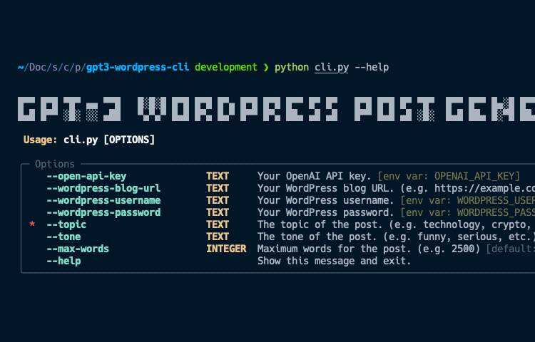 GPT3 WordPress Post Generator,这个脚本通过利用OpenAI GPT-3 API和OpenAI Python库进行API调用,以及利用WordPress XML-RPC库进行帖子创建,生成WordPress帖子。您可以控制生成的帖子的内容长度、主题,甚至语气(如搞笑、严肃、正式)。