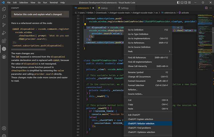 ChatGPT VSCode,一个Visual Studio Code扩展集成了ChatGPT API。它允许你在编辑器中直接提出自然语言问题并从OpenAI的ChatGPT中获得答案。它在侧边栏提供了一个用户友好的输入框来提出问题,一个面板来查看回答,并能够在保持对话背景的同时跟进其他问题。