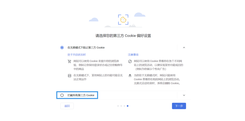 如果你还想在未来的会话中拦截跟踪cookies,请进入设置>隐私设置和安全性>Cookies和其他网站数据。现在,点击 “隐私保护指南”即可根据提示设置“请选择您的第三方 Cookie 偏好设置”。