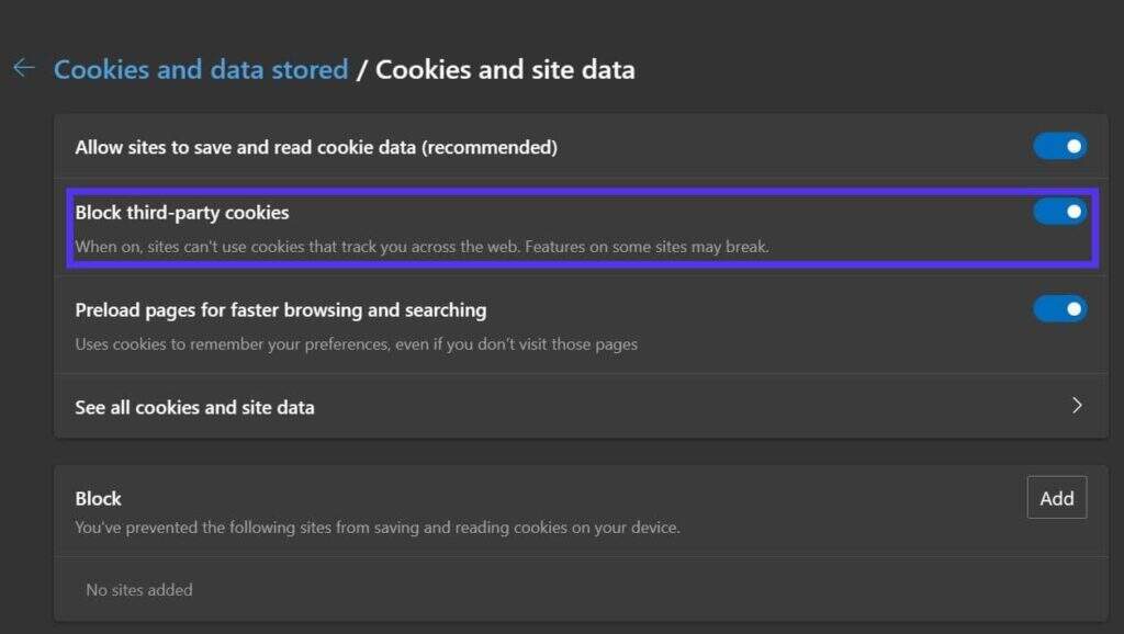 首先,你可能想拦截第三方网站在你的浏览器中保存跟踪cookies。要做到这一点,请点击 “拦截第三方cookies” 旁边的切换滑块。