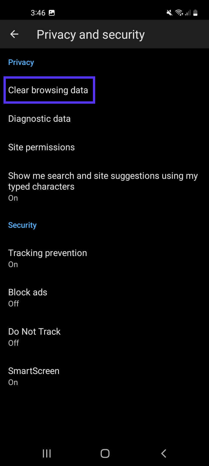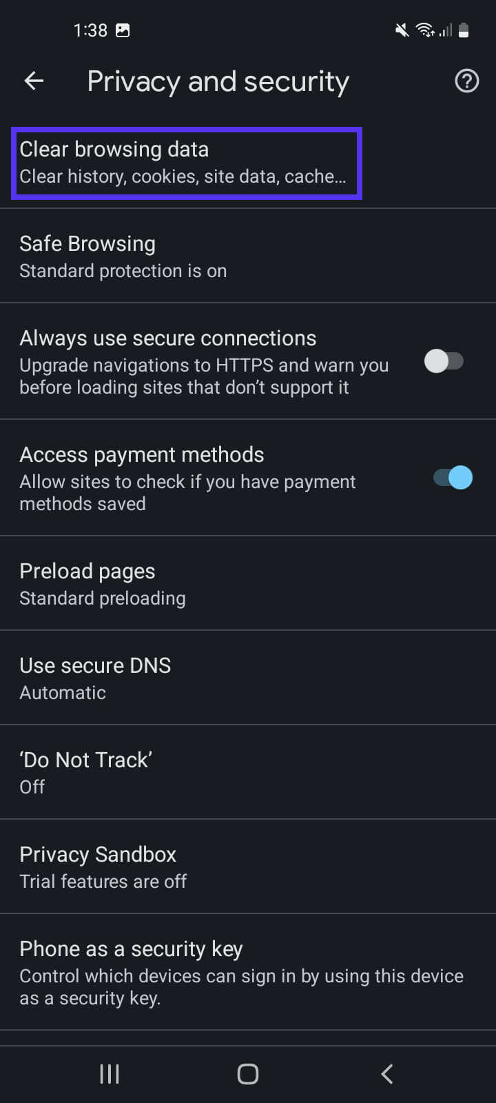 接下来,选择隐私和安全,然后是清除浏览数据: