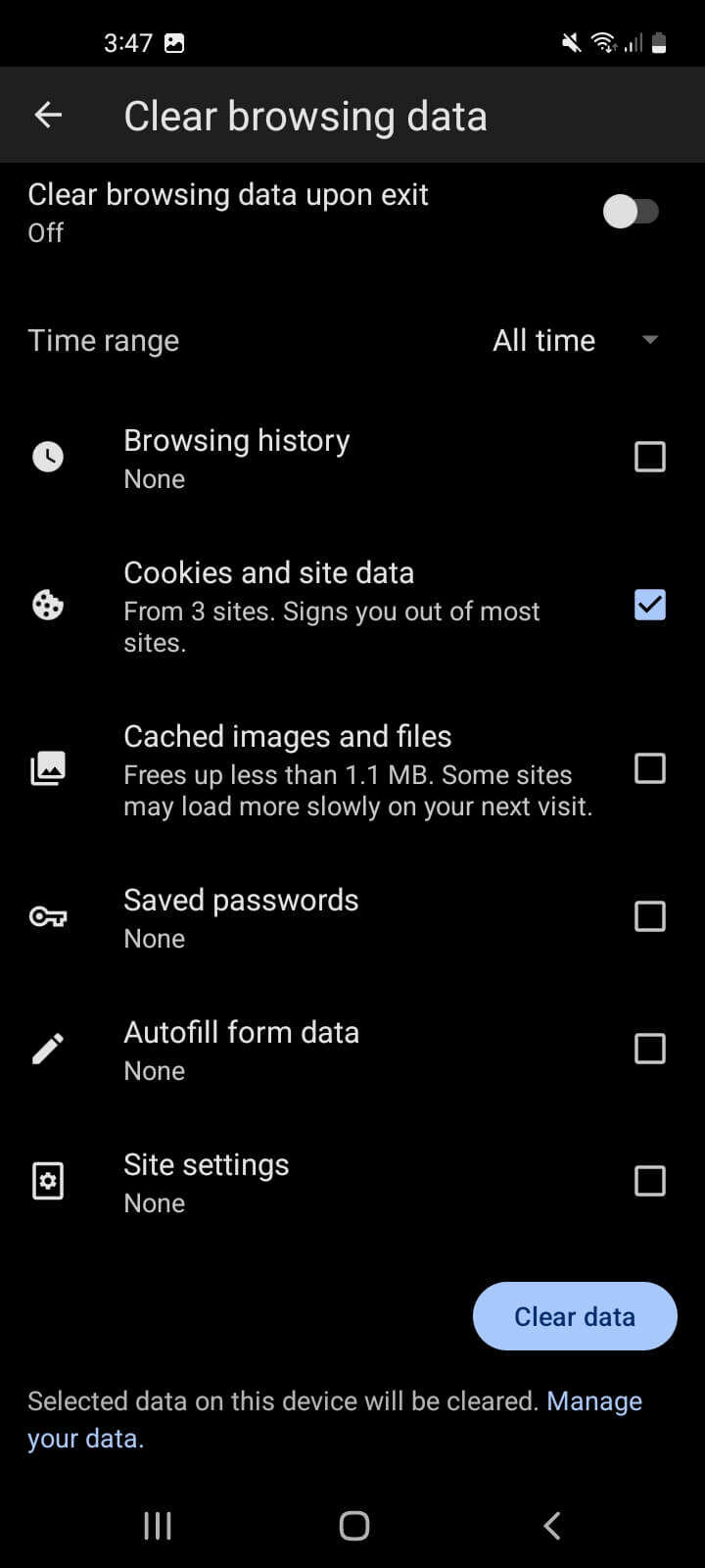 最后,勾选Cookies和网站数据旁边的方框,然后点击屏幕底部的清除数据。
