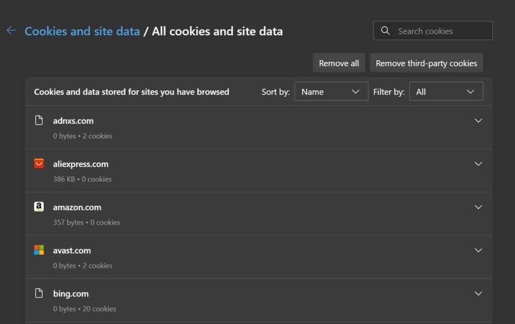 如果你点击 “全部删除“,Edge将删除浏览器中的所有cookies。或者,删除第三方cookies选项将只针对跟踪cookies。
