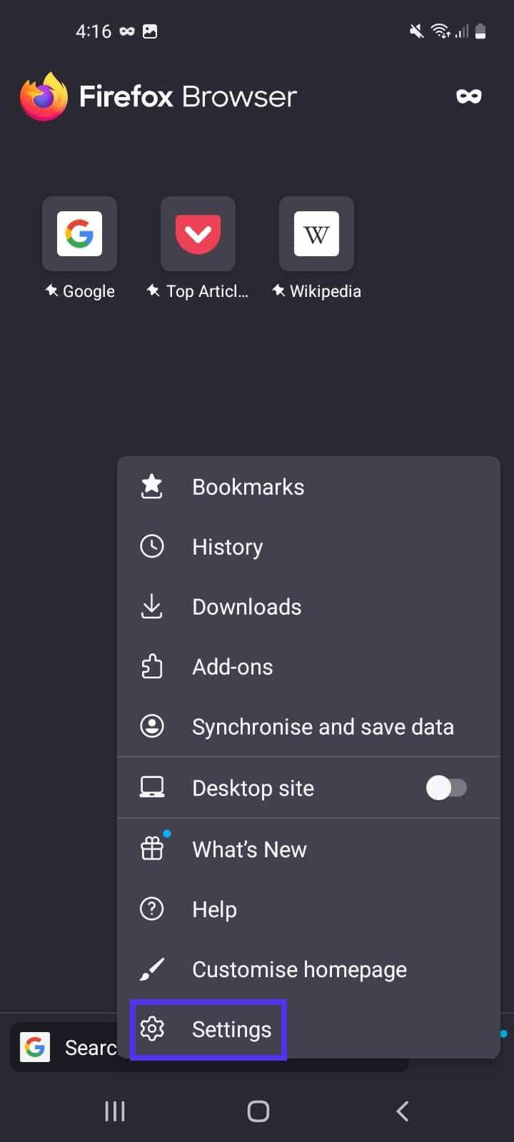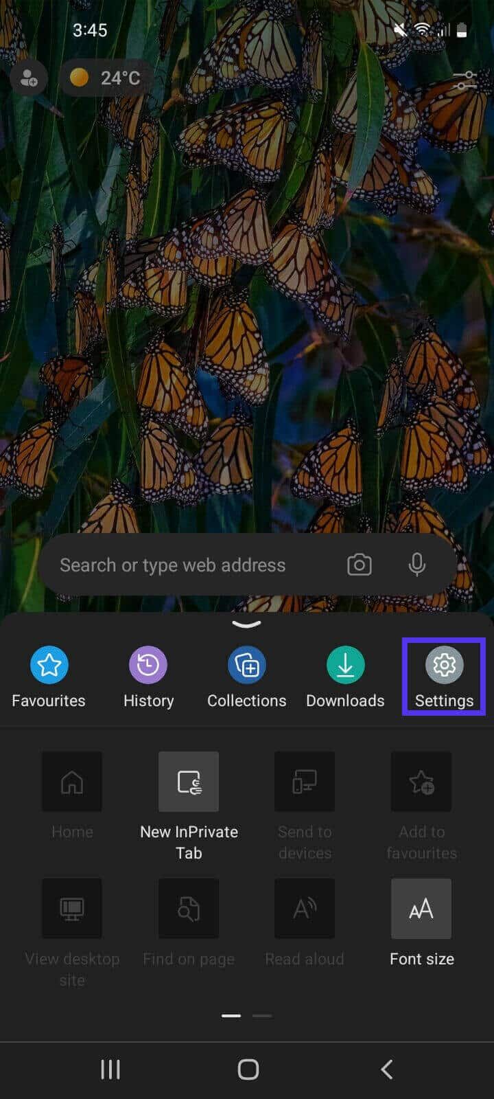 在移动设备上,你可以通过点击屏幕右下方的三个点来删除cookies。现在,选择设置: