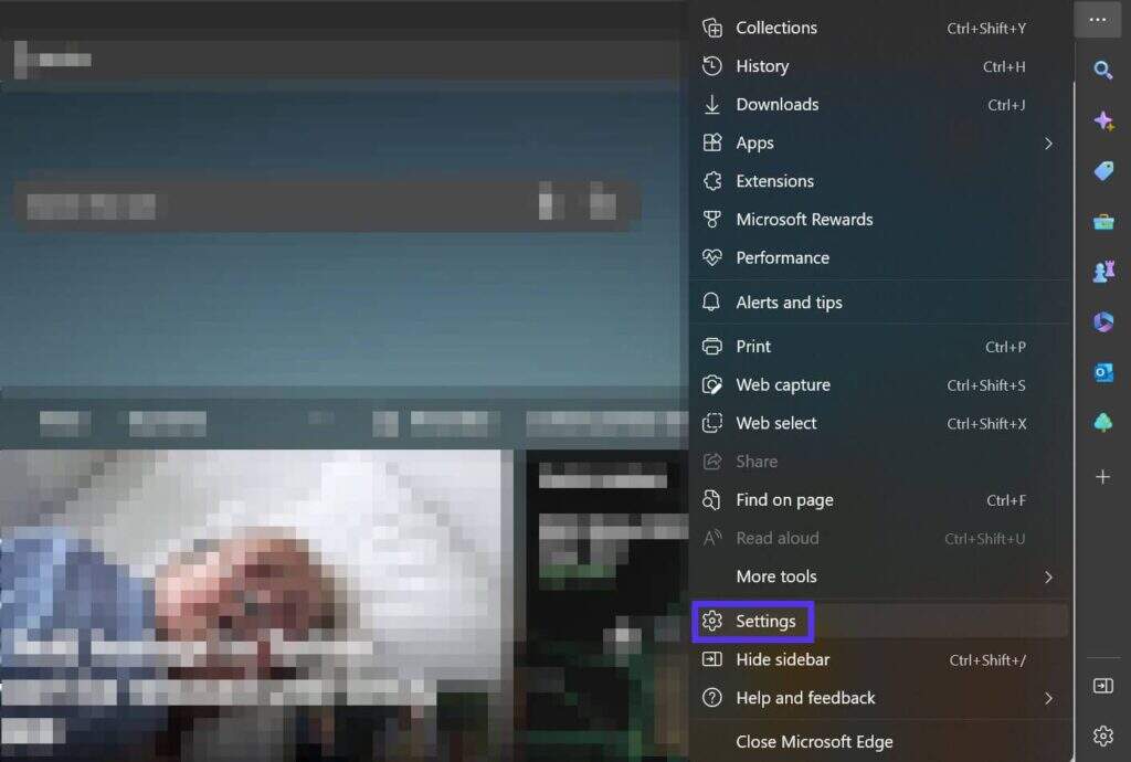 微软Edge也可以很容易地删除跟踪cookies。首先,选择浏览器窗口顶部的三个点,向下滚动到设置菜单的底部。然后,点击设置: