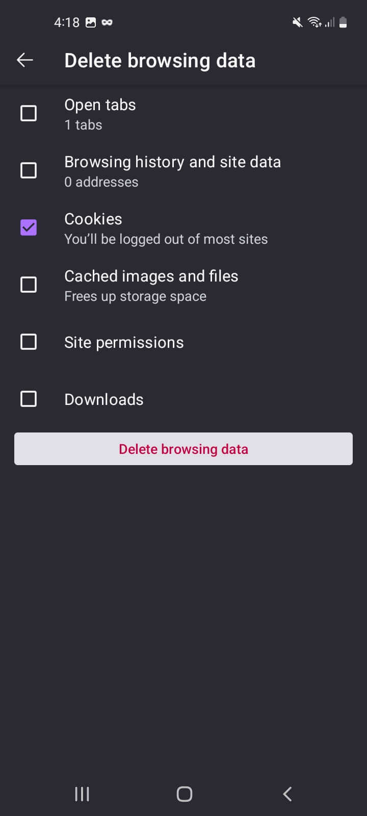 向下滚动到隐私和安全,点击删除浏览数据。确保你已经勾选了Cookies旁边的方框,然后点击屏幕底部的删除浏览数据: