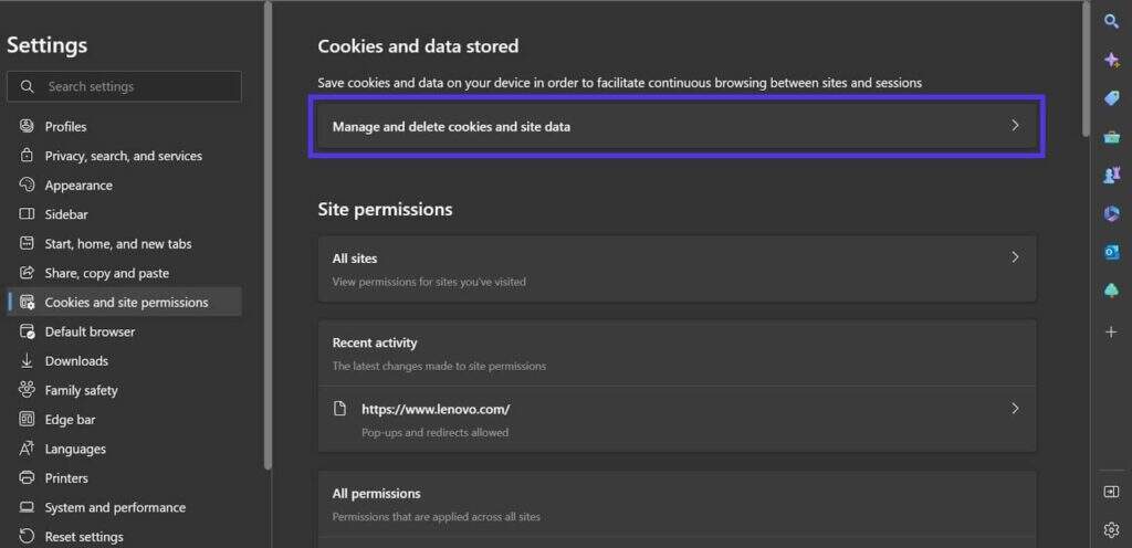 在左侧菜单的Cookies和网站权限下,选择管理和删除Cookies和网站数据: