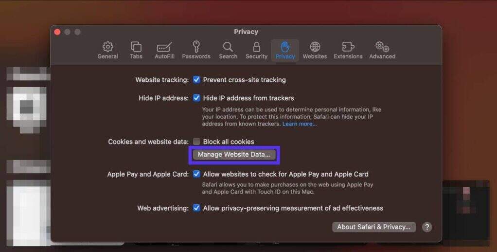 接下来,切换到隐私标签。你要确保 “防止跨网站追踪“旁边的方框被选中。然后,点击管理网站数据: