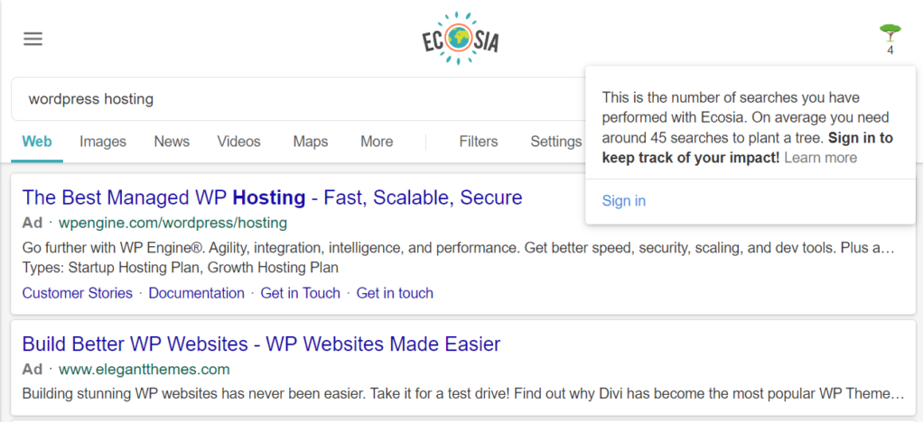 虽然Ecosia搜索结果由Bing提供支持,但搜索引擎也使用自己的算法“提高”其排名。如果您在两个搜索引擎上运行相同的查询,您会看到相似但不相同的结果。