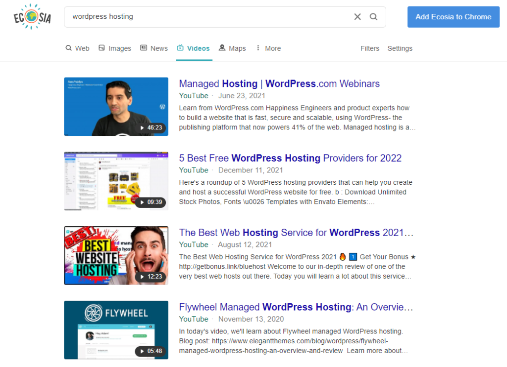 您仍然可以获得与Bing基本相同的视频搜索结果。然而,使用Ecosia感觉更像是谷歌而不是微软。