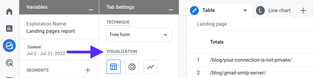 您可以通过选择Visualization下的选项之一来选择所需的报告类型(例如表格、圆环图、折线图等) 。