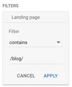 - 如果您希望过滤登录页面以查看特定页面或页面组,请在Tab Settings下向下滚动,然后点击Filters并选择您要过滤的维度或指标。例如,要查看所有博客文章,您可以将Landing page设置为contains /blog/。