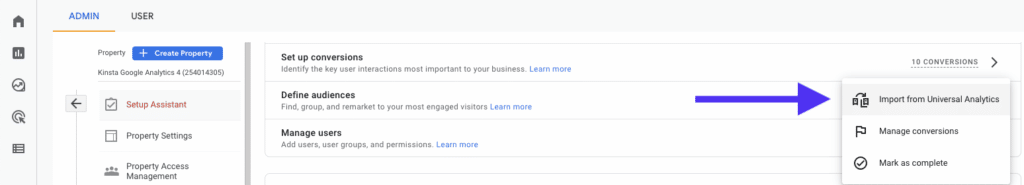 打开您的新GA4属性,然后单击Admin。单击 属性列中的Setup Assistant,然后导航到从连接的Universal Analytics属性中导入现有目标,然后单击Get started使用。您现在可以选择要将哪些目标迁移到您的GA4媒体资源。