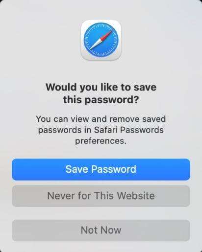 当您使用Safari并首次登录网站、电子邮件帐户或任何受密码保护的项目时,系统会询问您是否要保存/存储密码: