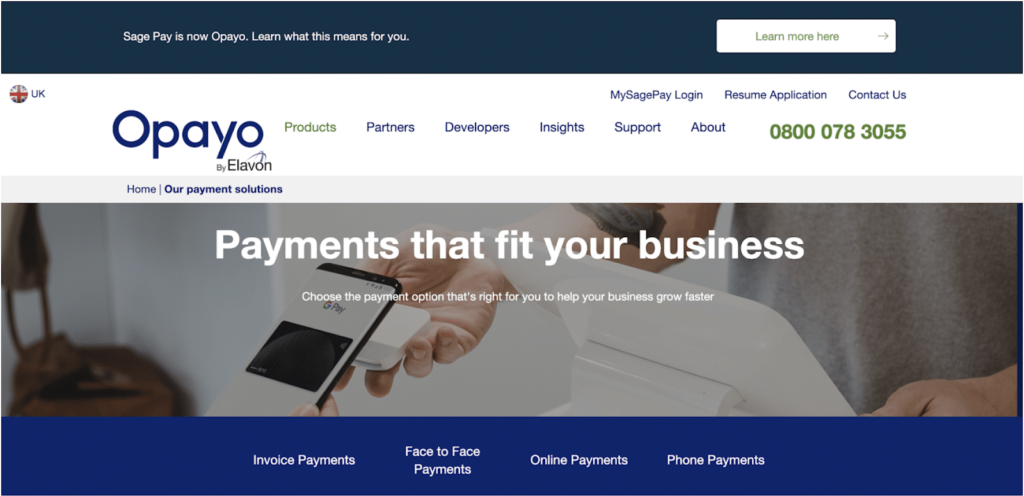 Opayo,以前称为Sage Pay,是由其母公司Elavon运营的在线支付工具。Opayo为企业提供发票、面对面、在线和电话支付。