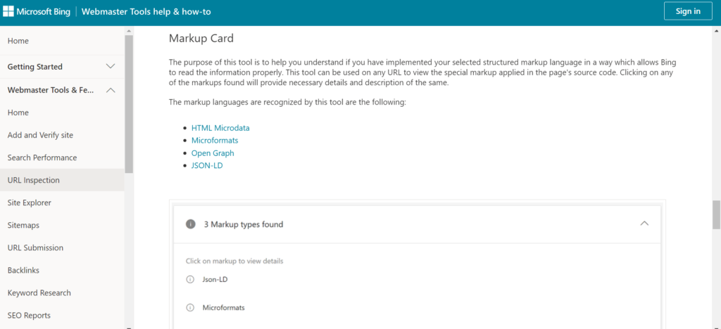 如果Bing是您的SEO策略的一部分, BingMarkup Validator可能会很方便。此工具可以测试各种语言的Bing丰富片段,包括HTML微数据、微格式、Open Graph和JSON-LD。