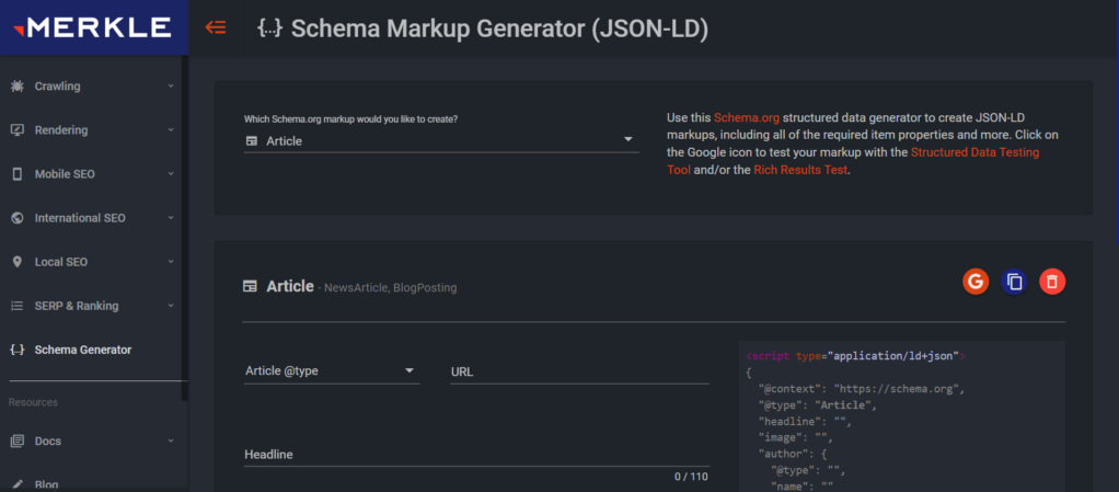 如果您正在寻找免费且用户友好的解决方案,Merkle可能是一个出色的Schema工具。您只需从下拉菜单中选择要使用的架构标记并输入一些附加数据。然后Merkle将在侧面板中创建结构化数据。