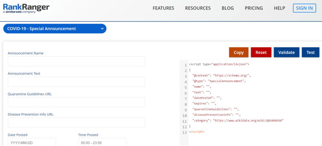 RankRanger是另一个免费的Schema工具,它使您能够生成结构化数据、复制数据,然后手动将其粘贴到您的网站中。它的工作原理与其他Schema标记程序类似。但是,您将可以访问不太常见的类别,例如COVID-19特别公告和操作方法文章。