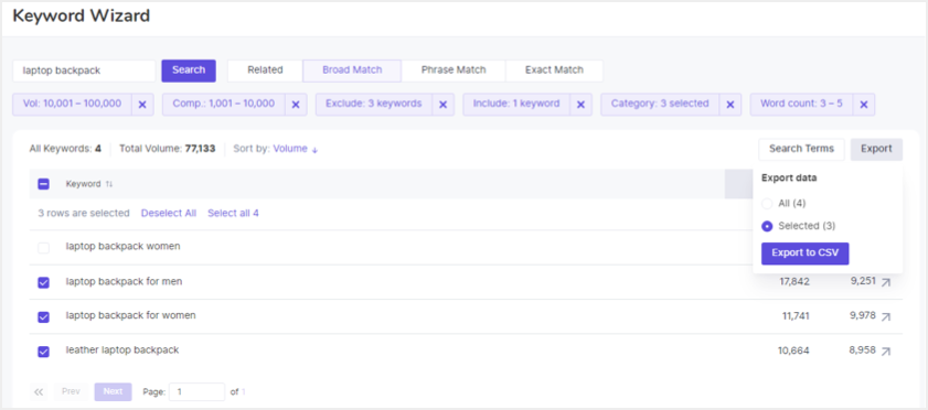 假设您正在销售“laptop backpack”。在“Amazon Keyword Wizard”搜索栏中输入关键字,然后点击“Search”按钮,如下图所示。结果页面将显示搜索量和竞争水平,并带有过滤选项,使您能够选择有效的关键字进行使用。