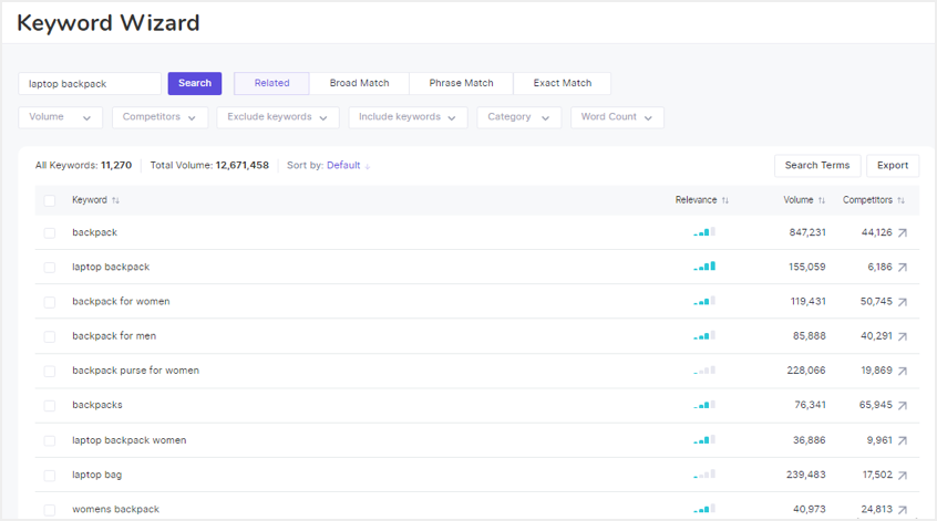 - 相关:它显示与确切关键字相似或相关的关键字,从而提供使用它们的最佳排名机会。示例——laptop backpacks。