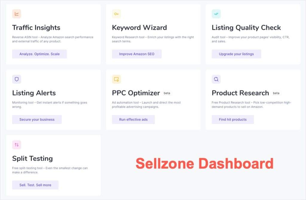 如前所述,Sellzone提供了一个包含七个工具的包。登录您的帐户后,您可以查看如下工具列表。虽然您可以独立使用某些工具,但您需要连接您的亚马逊帐户才能使用某些工具。