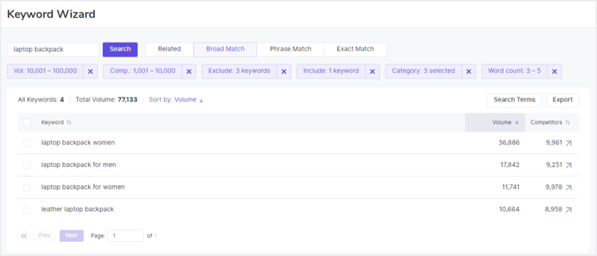 - “Include”选项可帮助您选择一些必须出现在应用其他过滤器后显示的关键字中的词,例如“laptop backpack”。