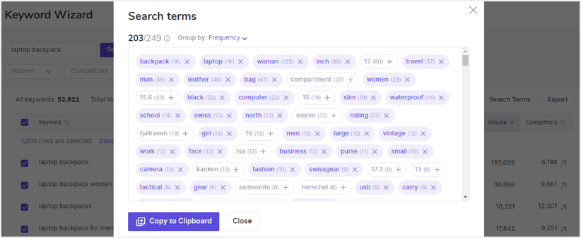 然后,单击“Search Terms”按钮,将显示一个仪表盘,其中仅包含与您的关键字相关的必要单词变体。检查它们,取消选择您认为不匹配的内容(例如正在使用的品牌名称和产品名称),并记住将所选内容保持在249个字符以内(根据亚马逊政策)。完成后,单击“Copy to Clipboard”并将其粘贴到您的亚马逊列表“Search Terms”字段中。