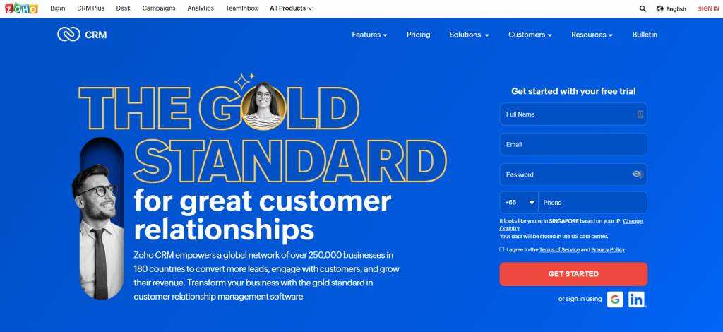 该CRM软件还提供了另外两种CRM解决方案——Zoho CRM Plus和Bigin。虽然Zoho CRM主要是一种销售CRM,但Zoho CRM Plus在一个界面上提供您的销售、营销和支持团队的整体视图。
