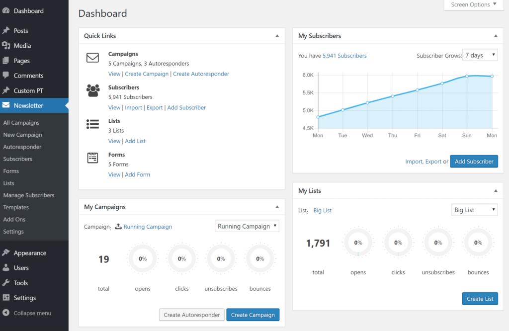 但是,事务性电子邮件服务也可以与第三方插件一起使用,使您能够从 WordPress 站点发送新闻通讯。Newsletter插件 和Mailster (如下所示)只是几个插件,它们可以将您的WordPress仪表盘和网站变成功能齐全的时事通讯报告和自动化工具。