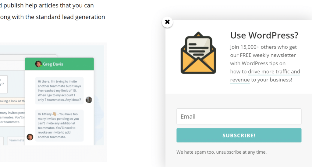 很多时候,插件用于构建您的列表并收集电子邮件,然后从第三方工具中配置和发送电子邮件。例如,我们使用此博客上的Bloom Email Opt-In插件 (如下所示)来收集电子邮件,它会自动将电子邮件发送到我们的MailChimp列表。另一个常见的例子是博客侧边栏或帖子底部的时事通讯小部件。