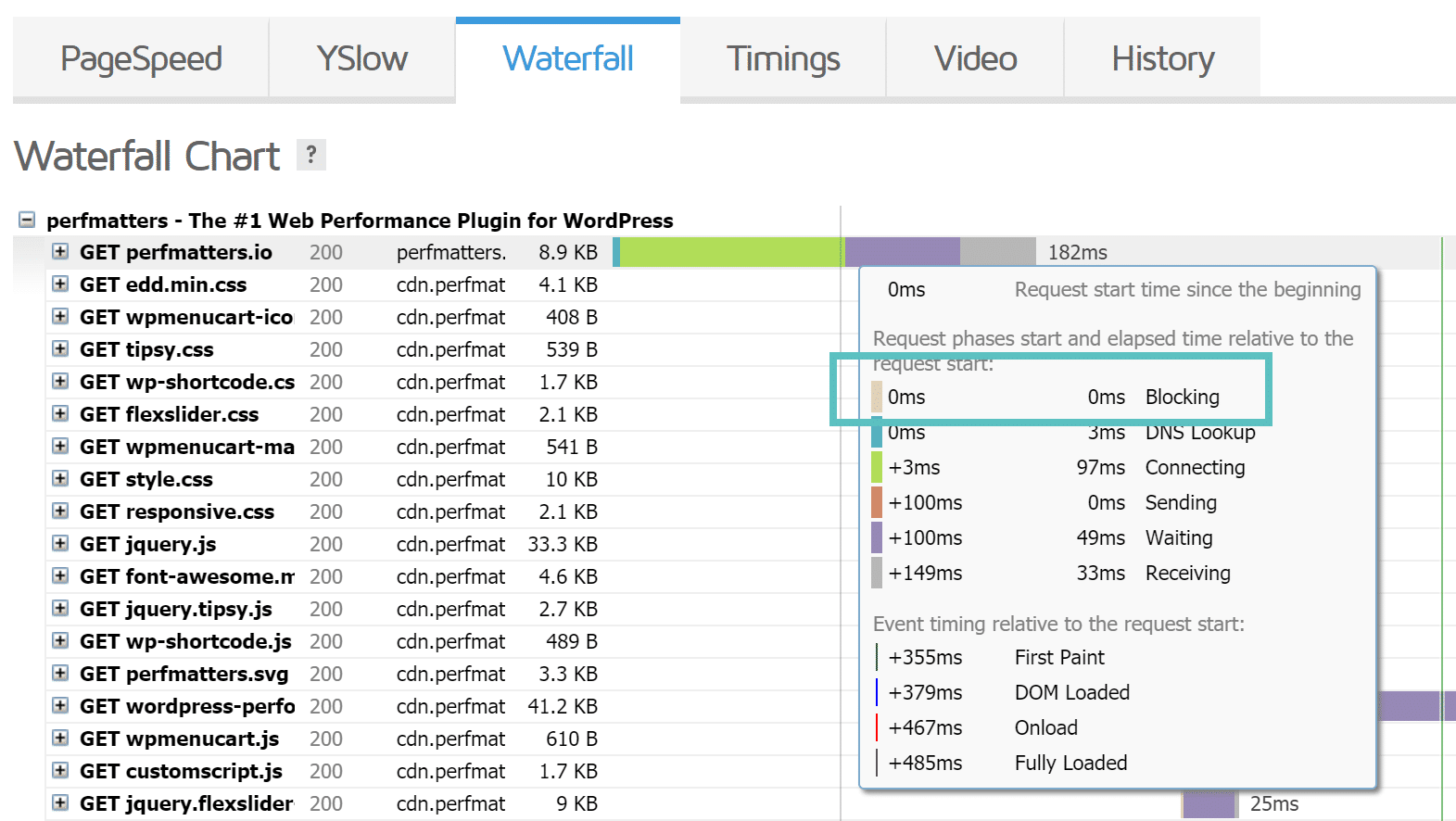 当浏览器加载网页时,JavaScript和CSS资源通常会阻止网页显示,直到它们被浏览器下载和处理。此时间延迟在GTmetrix瀑布图中显示为阻塞。查看我们关于如何消除阻塞渲染的JavaScript和CSS的深入文章以 获取更多信息。