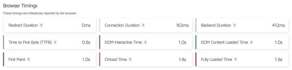 在页面的下方,GTmetrix还显示了一些更传统的“浏览器计时”统计信息,包括加载时间、第一个字节的时间、完全加载的时间等。在过去,这些传统指标非常重要。但是,随着Google为使用Web Vitals的标准化指标铺平道路,我们建议改为针对这些指标进行优化。在大多数情况下,您会发现针对Web Vitals进行优化也会产生良好的浏览器计时指标。