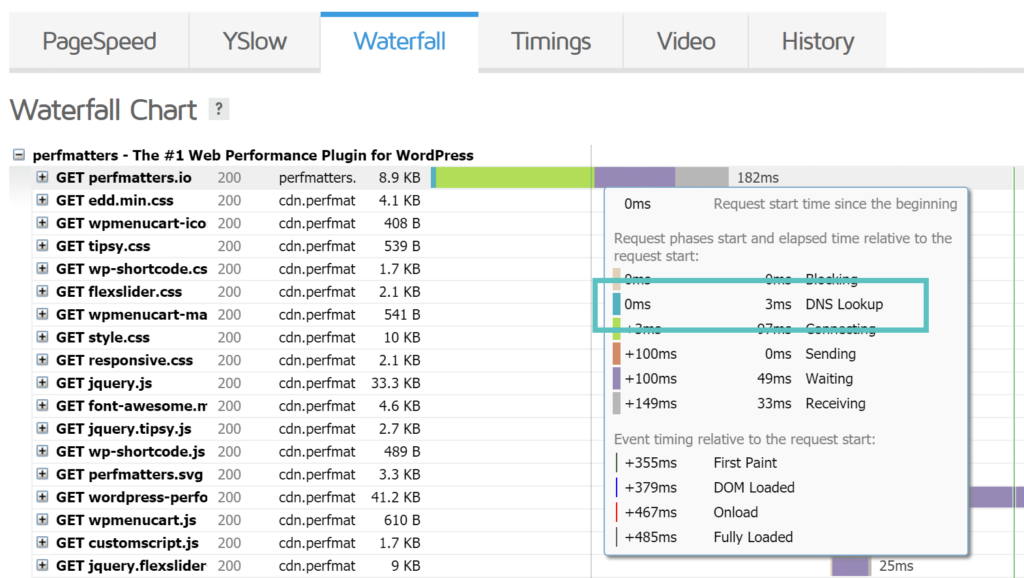 然后我们进行了额外的测试,现在我们的GTmetrix等级是“A”!那是怎么回事?如果您多次通过GTmetrix速度测试工具运行您的网站,您可能也会注意到这一点。发生这种情况的原因之一是缓存,包括DNS缓存和服务器缓存。在我们的瀑布分析中进一步了解原因。