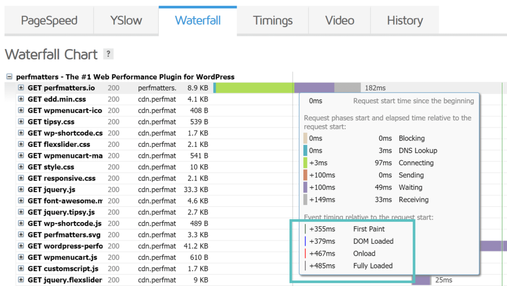 GTmetrix瀑布图显示您网页上的所有单个请求(如下所示)。然后,您可以分析每个请求,以查看导致站点延迟和性能问题的原因。下面是对每种颜色在每个请求中的含义的更深入的总结和/或定义。