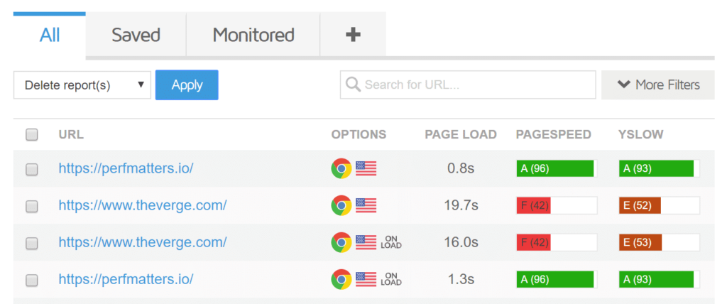 在历史选项卡下,您可以查看所有过去的速度测试。免费帐户中存储的数量是有限制的。您还可以监控一个URL,该URL允许您跟踪一段时间内的性能,并在它们发生时查看任何更改。