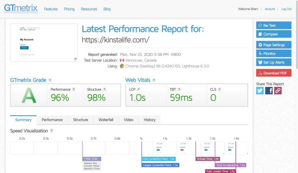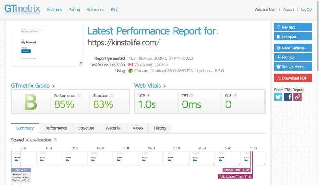 当您通过GTmetrix运行WordPress网站时,它会生成一份性能报告,其中包括您的“GTmetrix Grade”和“Web Vitals”。