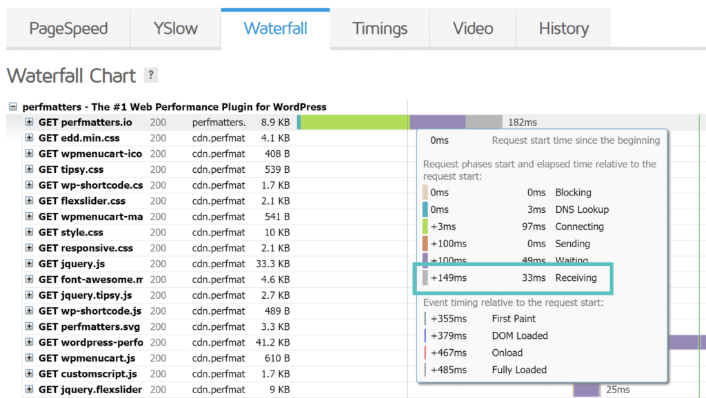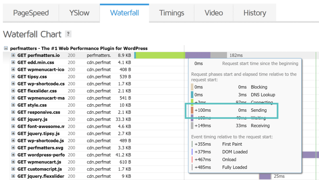 GTmetrix中的等待时间实际上是指到第一个字节的时间,在某些工具中也称为TTFB。TTFB是一种衡量Web服务器或其他网络资源响应能力的指标。一般来说,任何低于100毫秒的时间都是可以接受的,并且TTFB很好。如果您接近300-400毫秒的范围,您的服务器上可能有一些错误配置,或者可能是时候升级到更好的Web堆栈了。正如您在下面的测试中看到的那样,它大约是100毫秒,这很棒。