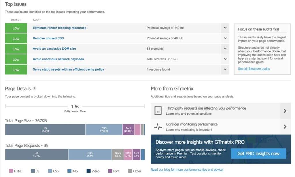 在概要页面的底部,还有“热门问题”和“页面详细信息”部分。在“热门问题”下,您可以看到要修复的高优先级项目列表,而“页面详细信息”提供页面的百分比和文件大小细分。