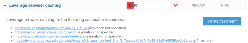 利用浏览器缓存是人们难以接受的一个非常常见的建议。这是由于您的Web服务器上没有正确的HTTP缓存标头而生成的。请参阅我们关于如何修复浏览器缓存警告的深入文章。您只能在您控制的资源上解决此问题。例如,如果您在第三方广告网络上看到此内容,则您无能为力。