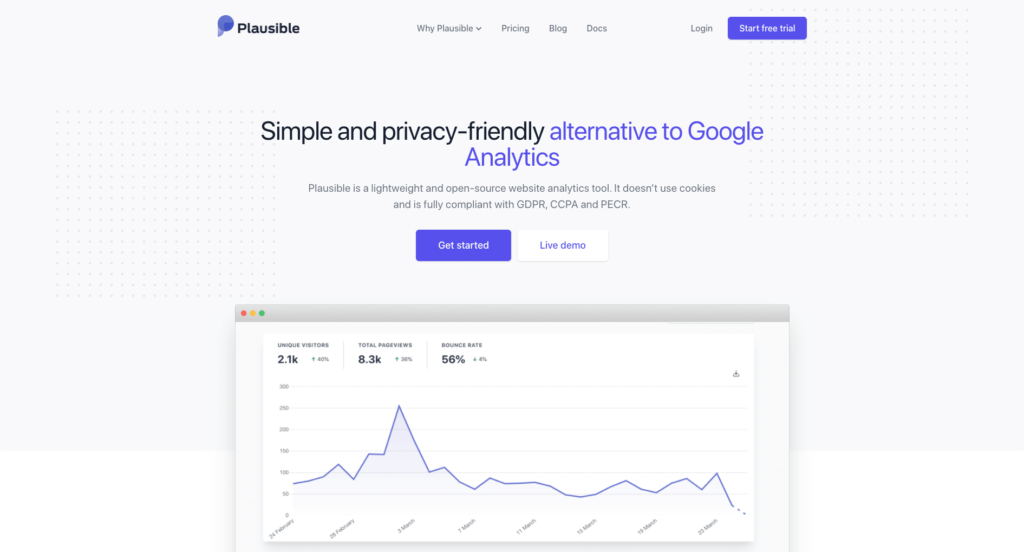 您可能要考虑的另一个Google Analytics替代方案是Plausible,这是一种轻量级的开源分析工具。与谷歌分析的主要区别是: